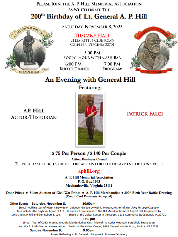 Our speaker for the November meeting will be Dale Harter, president of the Richmond CWRT. He will speak of BG Raleigh Colston, CSA. French by birth but VMI grad and instructor and CSA BG. After the War he went to Egypt to lead troops there. Spent his last days at the OSH.